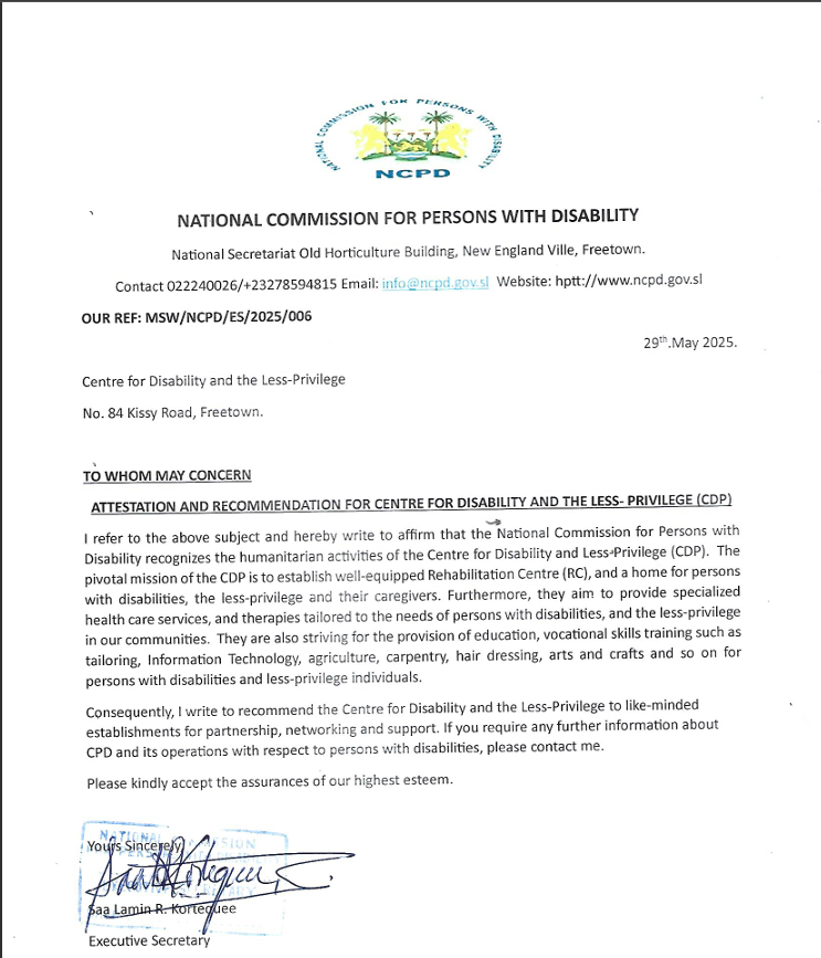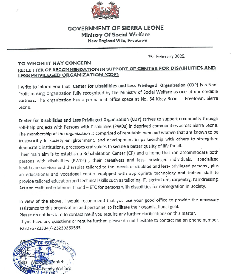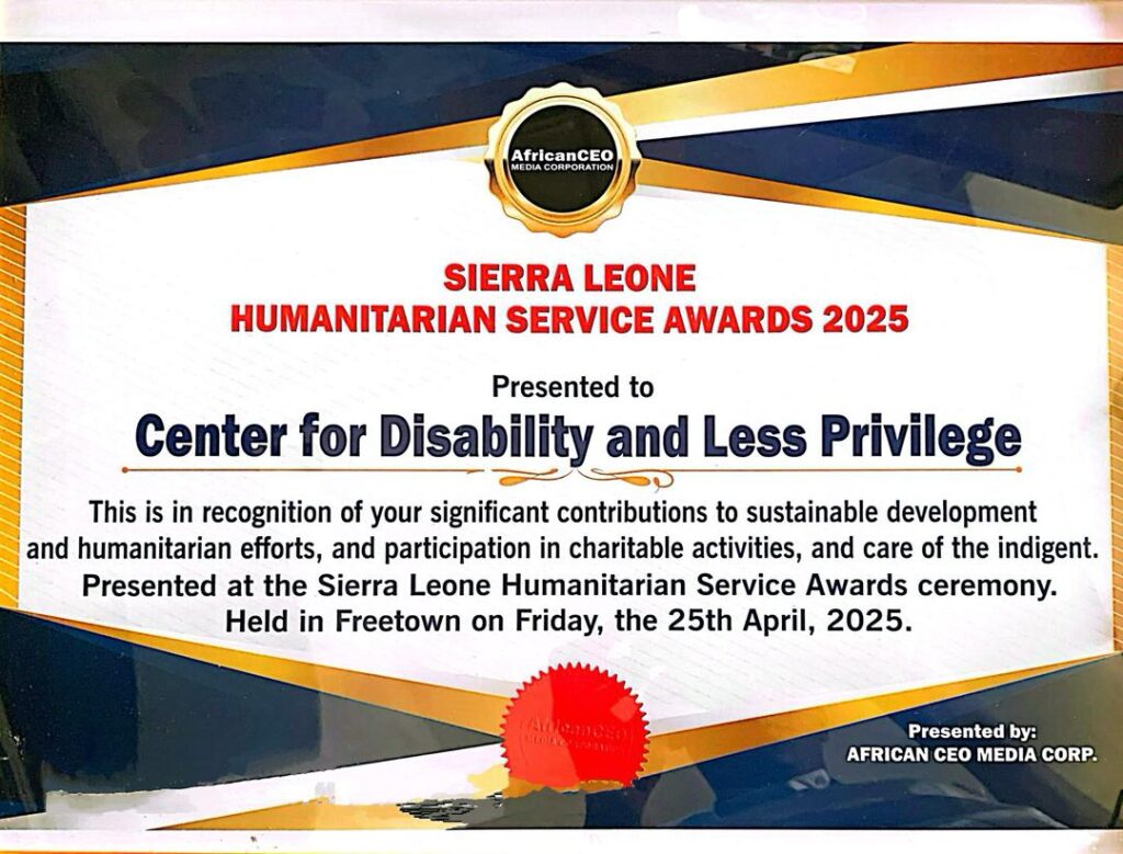 Huge milestone as CDP Sierra Leone received the 2025 Sierra Leone humanitarian Service Award!! This award is in recognition of CDP’s significant contributions to sustainable development and humanitarian efforts, and participation in charitable activities, and care for the Disabled and indigent. This award is dedicated to the over 95,000 disabled people in Sierra Leone!! Thanks to all the people who provide services for the Disabled!! Thanks to all of you that love the disabled people in Sierra Leone!! CDP is a vehicle of hope for Disabled people in Sierra Leone. I encourage all of you to join CDP at https://cdpsierraleone.com/donation-page/  to continue riding the vehicle of hope for the Disabled and Less privileged persons in Sierra Leone.